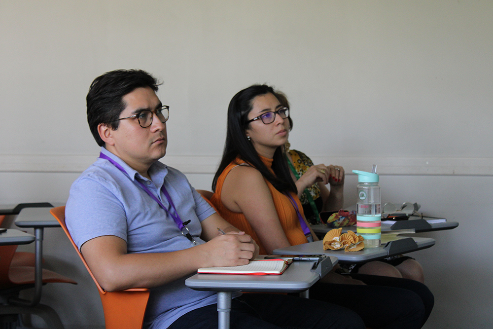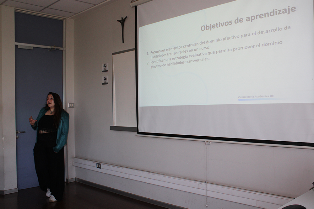 El taller fue dictado por Natalia Pérez-Luco, Psicóloga Educacional y profesional de autoformación, junto a Elizabeth Medina, Coordinadora Formación Docente del Centro de Desarrollo Docente UC, se refirieron al objetivo de la actividad, la cual se enfoca en reconocer e identificar, en un curso, elementos centrales del dominio afectivo para el desarrollo de habilidades transversales